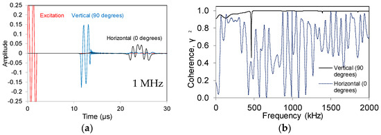 Figure 10a shows indicatively the wave emitted with excitation frequency at 1 MHz (in red), and the waveforms received by the medium sensor (5 mm) for the cases of source set on the surface (in black) and vertically beneath the sensor (in blue). It is shown that the similarity to the original wave is stronger for the vertically placed source, when two clear cycles are depicted, while for the case of surface waves, the major content of the Rayleigh waves shows four to five cycles instead of two. Figure 10b shows the corresponding coherence functions between the received waveforms and the excitation up to 2 MHz. The level of coherence is much higher for the direct propagation vertical to the sensor where the function is almost constantly close to unity, indicative of excellent similarity between the excitation and the sensor output. On the other hand, the coherence function of surface waves has significantly lower values with an average around 0.6 indicative of strong distortion that affects the received waveform.