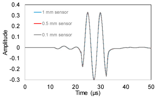 The waveforms are literally identical without distortion on the shape or the peak to peak amplitude. Therefore, considering that element sizes smaller than 1 mm are not commonly used in AE practice, the sensor of 1 mm was considered as reference.