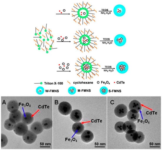 Schematic of Fabrication of (CdTe/Fe3O4)@SiO2 FMNS with Different Magnetic Potentials and TEM images of (CdTe/Fe3O4)@SiO2 FMNS: (A) W-FMNS, (B) M-FMNS, and (C) S-FMNS. Adapted from ref. [29].