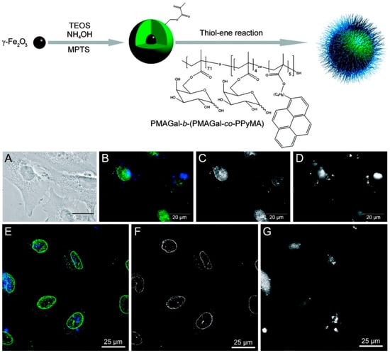 Synthesis of Fluorescent, Magnetic, Glycopolymer-Grafted Nanoparticles and Microscope images of A549 cells exposed to glycopolymer-grafted nanoparticles. (A–D) epifluorescence microscopy, (E–G) confocal microscopy. (A) Transmission image, (B,E) merged fluorescence images, (C,F) fluorescence images that exclusively show the green light emitting structures in the cell (nuclear membrane), and (D,G) fluorescence images that exclusively show the blue light emitting structures (pyrene in the glycocopolymer covered nanospheres). Adapted from ref. [38].