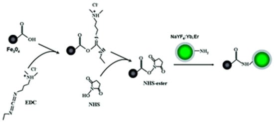 Schematic illustration of the formation of Fe3O4/NaYF4nanocomposites through EDC/NHS coupling chemistry. Adapted from ref. [41].
