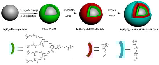 A different approach in the development of fluorescent and magnetic nanocomposites is the incorporation of polymer to the nanostructure. A magnetic core can be encapsulated or embedded into a polymer matrix which can be functionalized with different luminescent entities. For example, Lim et al. synthesized amphiphilic pyrenyl polyethylene glycol (PEG) by the conjugation of hydrophilic PEG with hydrophobic and fluorescent 1-pyrenebutyric acid through an esterification process resulting in a high UV fluorescent intensity in aqueous phase. The polymer was incorporated into MnFe2O4 magnetic nanoparticles (NPs) [18]. In another study, iron–platinum nanoparticles were embedded in a poly(methacrylic acid) (PMA) polymer shell and fluorescently labelled with the dye ATTO 590 [43]. Hydrophobic up-conversion nanoparticles (UCNPs) together with iron oxide nanoparticles (IONPs) were encapsulated by using an amphiphilic block copolymer, poly (styrene-block-allyl alcohol) (PS16-b-PAA10), via a microemulsion method, obtaining an UC-IO@Polymer multi-functional nanocomposite system. Fluorescent dye and anti-cancer drug molecules can be further loaded inside the UC-IO@Polymernanocomposite for additional modalities [44]. Magnetic-fluorescent semiconductor polymer nanospheres (MF-SPNs) have been synthesized by encapsulation of hydrophobic conjugated polymers and iron oxide nanoparticles in phospholipid micelles. Following the same synthesis, four different fluorescent conjugated polymers were used, yielding aqueous dispersions of nanoparticles which emit across the visible spectrum [45]. Novel water-soluble dendritic–linear–brush-like triblock copolymer polyamidoamine-b-poly(2-(dimethylamino)ethyl methacrylate)-b-poly(poly(ethylene glycol) methyl ether methacrylate) (PAMAM-b-PDMAEMA-b-PPEGMA)-grafted superparamagnetic iron oxide nanoparticles (SPIONs) were successfully prepared via a two-step copper-mediated atom transfer radical polymerization (ATRP) method by He et al. (Figure 5) [46]. Polymer-coated magnetic particles (MPs) were also prepared to study the binding of fluorescent dye (3-(dansylamino)phenylboronic acid) on the surface and its H2O2-induced release. For this goal, multilayer films were produced by LbL deposition of shikimic acid-appended poly(allylamine hydrochloride) (SA-PAH) and poly(styrenesulfonate) (PSS) on the surface of MPs [47]. Dual-modal fluorescent-magnetic nanoparticles with surface folic acid have also been produced by co-encapsulation of a far-red/near-infrared (FR/NIR)-emissive conjugated polymer (Poly[9,9-bis(6′-(N,N-dimethylamino)hexyl)fluorenyldivinylene-alt-4,7-(2,1,3,-benzothiadiazole)]) (PFVBT) and lipid-coated iron oxides (IOs) into a mixture of poly(lactic-co-glycolic-acid)-poly(ethylene glycol)-folate (PLGA-PEG-FOL) and PLGA [48]. Similarly, Fe3O4 nanoparticles coated with biodegradable poly (dl-lactic acid-co-α,β-malic acid) copolymer were covalently bound to FITC [49]. Wang et al. reported the preparation of (PEG)ylated polymeric lipid vesicles containing iron oxide nanoparticles and the anticancer drug doxorubicin (DOX) [50].