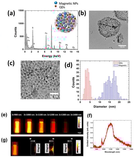 Top: Characterization of luminescent-magnetic HNS. (a) Compositional analysis (EDX) of a PLGA nanostructure denoting the presence of elements of both magnetic NPs and QDs. (inset) Schematic diagram of the magnetic NPs and QDs in the PLGA nanostructure; (b) TEM image of a typical PLGA nanostructure synthesized in this work; (c) A detailed TEM image of a PLGA nanostructure revealing the presence of two types of NPs inside the structure; (d) Size distribution of both types of particles obtained from TEM images. The size distribution corresponds to the sizes of the magnetic NPs and QDs (right). Fluorescence analysis; (e) Infrared fluorescence images of a PBS solution containing the HNS, as obtained under 808 nm laser excitation and by employing different long pass filters; (f) Emission spectrum of HNS; (g) IR fluorescence images of the same dispersion in the presence of a magnet, demonstrating the potential for the magnetic control of the nanostructures while enabling visual tracking through the IR luminescence. Adapted from [56].