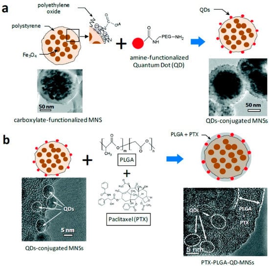 Schematic diagrams illustrating surface functionalization of MNSs: (a) Conjugation of amine-functionalized quantum dots (QDs) to the surface of carboxylate-functionalized MNSs using conventional NHS/EDC coupling method; (b) PTX loading using a thin PLGA coat on the surface of QD-MNSs. Adapted from ref. [62].