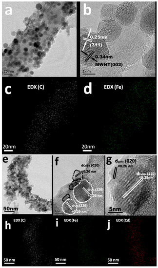 Morphological and structural characterizations of CNT-SPIO (a–d) and CNT-SPIO-CdTe nanohybrids (e–j) prepared by LBLassembly in combination with covalent connection technique: (a) bright field TEM image of CNT-SPIO; (b) HRTEM image of CNT-SPIO; (c,d) EDX elemental mapping of C and Fe with a specific CNT-SPIO nanohybrid respectively; (e) bright field TEM image of CNT-SPIO-CdTe; (f,g) HRTEM images of CNT-SPIO-CdTe; (h–j) EDX elemental mapping of C, Fe and Cd with a specific CNT-SPIO-CdTe nanohybrid respectively. Adapted from ref. [63].