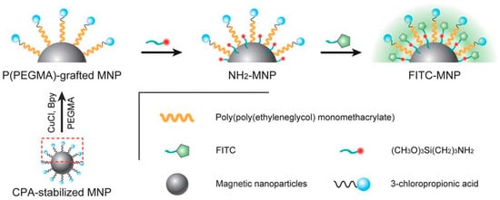 A polymer solution of high molecular weight polystyrene, superparamagnetic magnetite NPs and coumarin-153 dye were used to prepare nanowires in the range of 200 nm in length. The material was prepared by a facile route using vacuum infiltration in porous alumina membranes. The resultant nanowires were functionalised with Inmonoglobulin-G and AntiCD54 antibodies to confer dual imaging and immunoresponse modality [69]. Rhodamine-coated cobalt ferrite magnetic fluorescent (MF) nanoparticles linked to a quenching molecular system containing a miR124a binding sequence (MF-miR124a beacon) were synthesized xdzsaw [70]. Superparamagnetic nanoparticles (20–40 nm) of maghemite, γ-Fe2O3, with a well-defined stoichiometric structure, are synthesized by the borohydride reduction of ferric chloride at an elevated temperature (100 °C) followed by thermal treatment of the reaction product. The binding of the magnetic material with rhodamine B isothiocyanate results in the fluorescent magnetic nanocarrier providing, at the same time, a spacer arm for covalent immobilization of other biosubstances, including enzymes [71]. Water-soluble poly(poly(ethyleneglycol)monomethacrylate)-grafted (P(PEGMA)-grafted) Fe3O4 nanoparticles synthesized via a solvent-free atom transfer radical polymerization (ATRP) method were conveniently surface-modified with 3-aminopropyltrimethoxysilane as anchor molecules to donate NH2 groups. Fluorescent magnetic NPs were then obtained by covalently bonding FITC to the NH2 groups (Figure 9) [72].