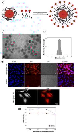- Yen, S.K.; Jańczewski, D.; Lakshmi, J.L.; Dolmanan, S.B.; Tripathy, S.; Ho, V.H.B.; Vijayaragavan, V.; Hariharan, A.; Padmanabhan, P.; Bhakoo, K.K.; et al. Design and Synthesis of Polymer-Functionalized NIR Fluorescent Dyes–Magnetic Nanoparticles for Bioimaging. ACS Nano 2013, 7, 6796–6805. [Google Scholar] [CrossRef] [PubMed]