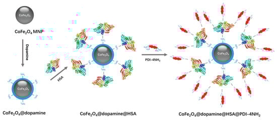 Huand et al. used a second-generation photosensitizer Chlorin e6 (Ce6) that was covalently conjugated to the surface of the magnetic nanoparticles with a silane coupling agent. Ce6 molecules retained their spectroscopic properties and functionalisation to be used in various imaging applications [73]. Wate et al. fabricated a multicomponent nanostructure system that involves the covalent attachment of 3 components; Fe3O4 (Fe) NPs, PAMAM-G4-NH2 (G4) dendrimer and Cy5 (Cy) on a graphene oxide (GO) surface to develop a biologically multifunctional system. The resultant GO-G4-Fe-Cy nanosystem exhibits high dispersion in aqueous media, and is magnetically responsive and fluorescent [74]. Yen et al. reported the synthesis of an amphiphilic polymer, poly(isobutylene-alt-maleic anhyride)-functionalized near-infrared IR-820 dye and its conjugates with iron oxide (Fe3O4) magnetic NPs for optical and MRI imaging (Figure 10) [75]. After the absorption of dopamine, human serum albumin (HSA) was attached to the surface of the CoFe2O4 magnetic NPs through a reversible non-covalent bond between HSA and –NH2 in dopamine. With the same type of interaction, the designed perylenediimide (PDI) based –NH2 rich fluorescent molecule (PDI-4NH2) was decorated onto the HSA-modified CoFe2O4 nanoparticles (Figure 11) [76].