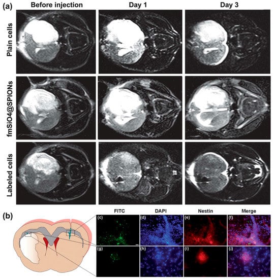 - Zhang, L.; Wang, Y.; Tang, Y.; Jiao, Z.; Xie, C.; Zhang, H.; Gu, P.; Wei, X.; Yang, G.-Y.; Gu, H.; et al. High MRI performance fluorescent mesoporous silica-coated magnetic nanoparticles for tracking neural progenitor cells in an ischemic mouse model. Nanoscale 2013, 5, 4506–4516. [Google Scholar] [CrossRef] [PubMed]