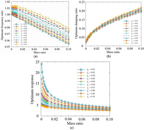 Ioi and Ikeda [37,38] proposed an improved design method considering structural damping, whose optimization goal is to minimize the maximum acceleration dynamic amplification factor of primary structure under external harmonic excitations. The optimum formulas of the Ioi and Ikeda method are shown in the following.