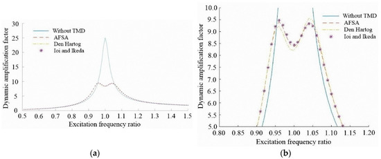 It is shown in Figure 5 that the maximum dynamic amplification factor without a TMD is 25.00, while with the TMDs designed based on the AFSA, Den Hartog and Ioi and Ikeda methods it is 9.41, 9.56 and 9.48, respectively. Compared to the situation without a TMD, the TMD designed based on the AFSA, Den Hartog and Ioi and Ikeda methods has a reduction of 62.36%, 61.76% and 62.08%, respectively. It can be seen that the vibration control effect of the TMD designed based on the AFSA method is slightly better than that of the TMD designed based on the remaining two methods.