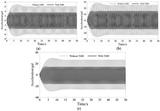 The comparisons of the structural response under 2.00 Hz walking, running and jumping excitations are shown in Figure 6. Note that the unit of acceleration “gal” means “1 cm/s2”.