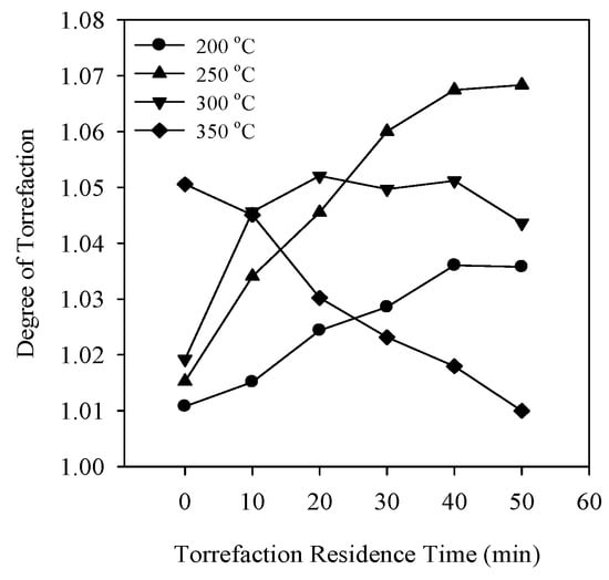 | Torrefaction Residence Time (min) | 200 °C | 250 °C | 300 °C | 350 °C | ||||||||||||||||