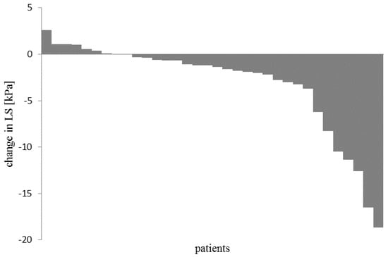 Figure 1. Reduction of liver stiffness between EOT and FU96 in individual patients. Each column represents one patient and the change in liver stiffness between end of treatment and 96 weeks later. LS—liver stiffness; kPa—kilopascal.