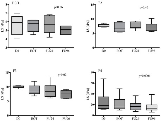 Figure 2. Median values of sequential LS measurement according to baseline fibrosis stage. EOT—end of treatment; FU24—follow-up visit at week 24 after treatment; FU96—follow-up visit at week 96 after treatment; F0/1—F4: METAVIR scores; LS—liver stiffness; kPa—kilopascal; the upper and bottom side of each box represent 25th and 75th percentile (interquartile range); the line passing through the field indicates the median; whiskers indicate minimum and maximum. Statistical method: analysis of variance ANOVA.