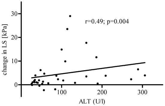 Figure 4. Correlation (Spearman’s rank correlation coefficient) between ALT activity at baseline and changes in LS between baseline and FU96. ALT—alanine aminotransferase; LS—liver stiffness; kPa—kilopascal.