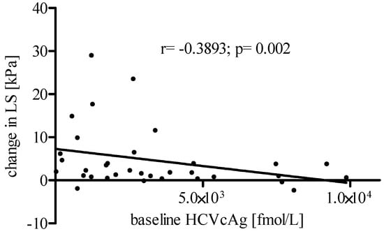 In our study, all patients achieved an SSR, i.e., HCVcAg was undetectable at the end of treatment and this effect was maintained during a six-month follow-up. We also found a statistically significant negative correlation between changes in LS between baseline and FU96 and baseline HCVcAg. Considering that the level of LS changes depends on the severity of inflammation (ALT), a lower concentration of HCVcAg may allow an increased inflammatory response and therefore changes in LS are bigger. However, the importance of this correlation requires further research on a larger group of patients.
