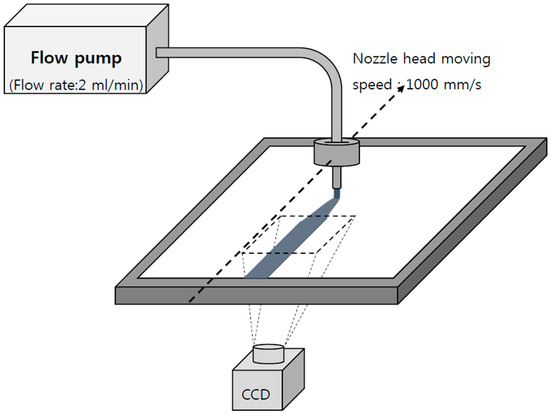 The nozzle printer (prototype made by Device Eng, Asan-si, Korea) used in the present study consists of a stage, a motored nozzle head, a liquid pump (Havard apparatus-PHD ULTRATMCP, Havard, MA, USA), and a charge-coupled device (CCD) camera (Basler-acA 1300-30 gm, Ahrensburg, Germany), as shown in Figure 1. The stage of the nozzle printer can accommodate a substrate of 100 mm × 100 mm size. The CCD camera is located under the stage to capture the coating process through a transparent substrate such as an ITO/glass substrate. The motored nozzle head can be equipped with various nozzle types and move with a maximum speed of 1000 mm/s to the y-axis direction. The used SUS nozzle has an external diameter of 0.23 mm and an internal diameter 0.1 mm, and it is connected to the liquid pump that helps to ensure a constant flow though the nozzle. In this experiment, the nozzle moving speed and flow rate of the coating solution were fixed at 1000 mm/s and 2 mL/min, respectively.
