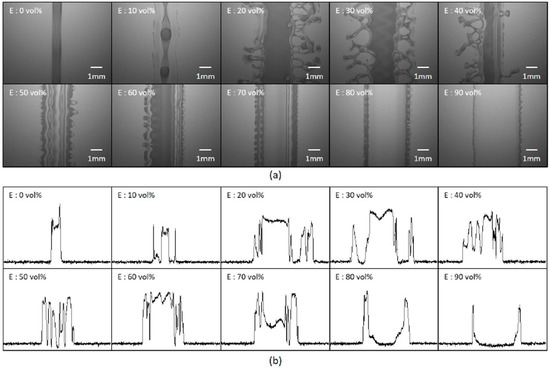 (a) Charge-coupled device (CCD) camera images of poly(3,4-ethylenedioxythiophene) polystyrene sulfonate (PEDOT:PSS) pattern with containing various rate of EtOH solvent. (b) Shape of PEDOT:PSS patterns with various conditions by Simulating of Grey scale method.