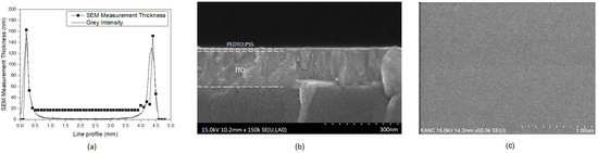 As a result, the optimized thickness uniformity was obtained at 90% EtOH volume concentration in PEDOT:PSS solution, and SEM was used to measure the actual thickness. To determine the uniformity by grey intensity, the thickness profile of the width was measured at intervals of 100 μm using SEM. Figure 3 shows the line width thickness profile measured by grey intensity and SEM. The thickness of both ends of the line was measured as about 160 nm due to the coffee ring effect and the thickness except for at both ends was measured to be about 18 nm. A thickness of about 18 nm was uniformly measured over about 3.5 mm scanning length. Also, we observed good film uniformity without any pinhole defects in Figure 3c.