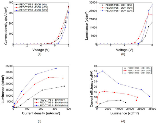 Finally, as seen from the results of the above PEDOT:PSS pattern behavior according to the dilution rate of EtOH, we fabricated the OLED device structure as glass/ITO/printed-PEDOT:PSS (w/EtOH 0%, 40%, 90%)/CBP:Ir(mppy)3 (10% doped)/TPBi/LiF/Al. The whole group of OLED devices had a spectrum that arose in the electro luminance (EL), where a maximum peak of 515 nm was achieved. Additionally, EL spectrum yielded 1931 Commission Internationale de L’Èclairage (1931 CIE) chromaticity coordinates of (0.296, 0.623) approximately. According to the EL spectrum and CIE chromaticity coordinates, the nozzle-printed HIL based device emitted green light without any color shift. Figure 4 shows the I-V-L characteristics of the OLED devices. From the voltage-current density graph and voltage-luminance characteristics, device operated at almost 5 V (Figure 4a,b). Typically in the OLED device structure of glass/ITO/printed-PEDOT:PSS (w/EtOH 0%, 40%, 90%)/CBP:Ir(mppy)3 (10% doped)/TPBi/LiF/Al, the turn on voltage is approximately 4 V. However, as seen in Figure 4a,b, the device samples fabricated by the nozzle printing process shifted to relatively higher voltage because the nozzle printing process had poor overall film uniformity compared with the spin-coating process. Figure 4c shows the current density-luminance data. As seen in the graph, when the EtOH percent was increased, a high value of luminance was shown in the same current density scale. The OLED device based on PEDOT:PSS with EtOH of 90% had 35,000 cd/m2 maximum luminance at 300 mA/cm2, and the OLED devices based on PEDOT:PSS with EtOH of 0% and 40% recorded values of about 17,000 cd/m2 and 25,000 cd/m2 at 300 mA/cm2, respectively. Lastly, in Figure 4d, maximum current efficiency of 35 cd/A was recorded in the device sample of PEDOT:PSS-EtOH (90%) while PEDOT:PSS-EtOH (0%, 40%) showed values of 5 cd/A and 15 cd/A. This difference was caused by the film uniformity of the PEDOT:PSS layer with variation of the EtOH concentration. When a greater amount of EtOH (about 90%) was added to the PEDOT:PSS solution, spreading, shrinking, and drying behaviors were optimized for the formation of a uniform film layer.