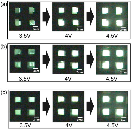 Electro-luminescence (EL) images of OLED with various conditions of solvent ratio and voltage variations: (a) pristine PEDOT:PSS based EL image; (b) EtOH of 40% containing ratio in PEDOT:PSS based EL image; and (c) EtOH of 90% containing ratio in PEDOT:PSS based EL image.