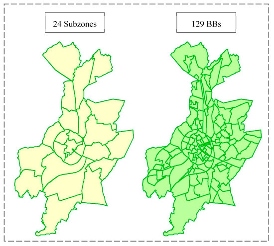 Although a large amount of useful information can be deduced at this layer, the size of each Subzone—an average area of around 6 km2—is still too large to avoid trip generation and attraction focusing too much on one point (e.g., TAZ centroid), which might result in unreasonable traffic allocation with some congested links and some empty links. Therefore, a zoning system with higher resolution is desired to implement the FEATHERS framework on. To this end, a Building Block (BB) layer is introduced. It is the most disaggregated geographical level currently applicable in Belgium, which consists of 10,521 units with an average area of 1.3 km2. Taking the city of Leuven as an example, it is one of the Superzones in the geographical structure, which consists of 24 Subzones or 129 BBs (see Figure 3).