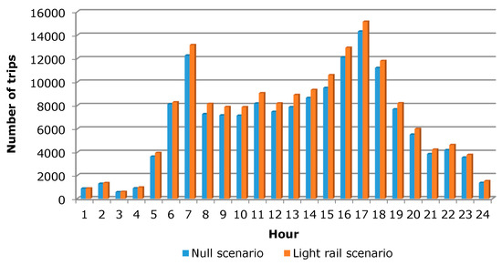 Based on the average value of the model outputs, we find that the addition of the light rail network has a relatively positive impact on public transport trips in Leuven, but a relatively negative impact on non-motorized modes such as cycling. The share of public transport trips increases by approximately 8% compared to the null scenario. The detailed change in the number of trips in each hour of the day is illustrated in Figure 5. On the other hand, non-motorized trips reduced by over 4%, probably due to the convenience of taking the light rail, which attracts some road users (such as cyclists) to change their mode of travel. However, concerning the car-related transport modes, including both the car as driver and car as passenger, the change in the number of related trips is negligible, since the value of zero is located within the difference range among the runs, which is [−0.13%, 0.57] and [−0.97%, 0.93%], respectively. Such a result implies that the implementation of a light rail system has only limited effects on car-related transport, especially in the short term.