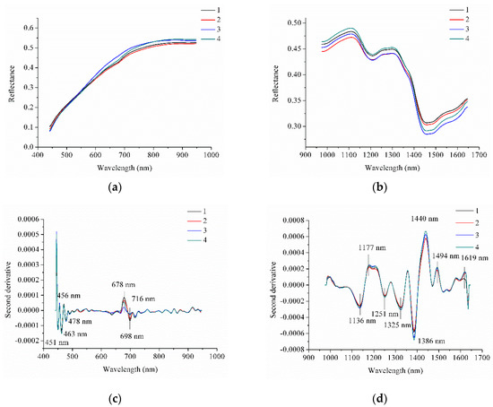 The spectral range of 441–948 nm (Spectral range 1) for visible/near-infrared system and 975–1646 nm (Spectral range 2) for near-infrared system were analyzed. The average spectra of 4 varieties of rice seeds in two different spectral ranges are shown in Figure 3a,b, and corresponding average spectra preprocessed by second derivative (polynomial order: 2, smoothing points: 7) are presented in Figure 3c,d.