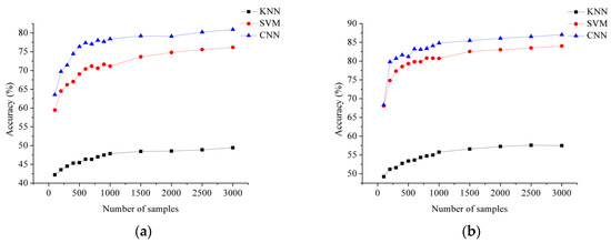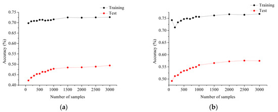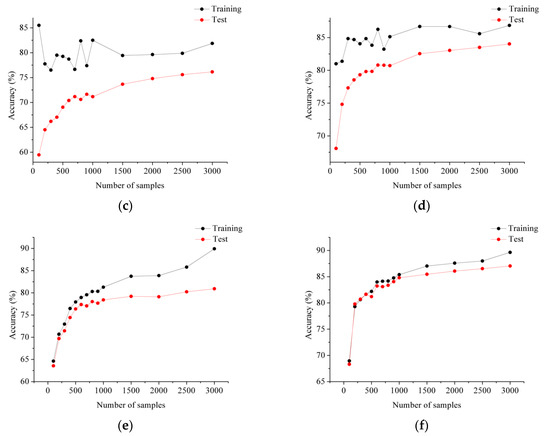 As shown in Figure 4, the classification accuracy of the training and test set of different models increased with the increase in the number of samples in the training set. Some fluctuations could be observed from the classification accuracy of the training set. When the number of samples came to a critical value, the increase rate of classification accuracy was small. For different models, the critical values were different. The models using 3000 training samples performed best since large training set is expected to contain a more extensive set of different types of feature combinations and feature values than small training sets.