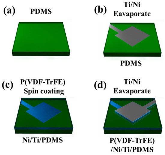 (a) PDMS substrate (3.5 cm (W) × 3.5 cm (L) × 0.15 cm (H)) was made by elastomer and cross linker (weight ratio 10:1); (b) Ti/Ni (30 nm/150 nm) was deposited on the PDMS substrate by electron beam evaporator; (c) P(VDF-TrFE) was spin-coated on Ni/Ti/PDMS at 3500 rpm for 60 s; (d) Ti/Ni (30 nm/150 nm) was deposited on the P(VDF-TrFE)/Ni/Ti/PDMS by electron beam evaporator. After that an electric field of 100 MV/m was applied for 1 h to align the dipoles in the P(VDF-TrFE) film uniformly.