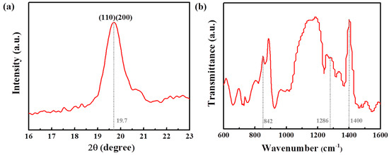 Once the composition and thickness had been optimized, we performed structural characterization using the XRD technique on the prepared P(VDF-TrFE) film, and the results are shown in Figure 3a. We found that the orientation planes (110) and (200) shown in the XRD spectra are related to the polar β-phase, since the diffraction peak position is shown at a 2θ value of 19.7° [26,27]. FTIR measurements were also carried out to further confirm the presence of β-phase P(VDF-TrFE). Figure 3b indicates the signature FTIR spectra of the film, with 3 peaks corresponding to the β-phase P(VDF-TrFE): 842 (CH2 rocking), 1286 (trans band) and 1400 (CH2 wagging) cm−1 [18,28]. Taken together, these tests clearly indicate that the synthesized film is indeed P(VDF-TrFE).