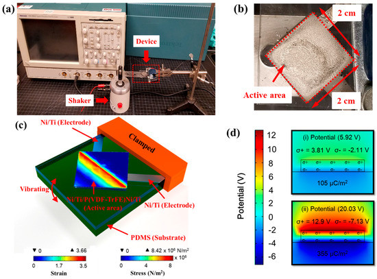 (a) Photographic image of the basic experimental setup and (b) image of the device under test; (c) Finite element (COMSOL) simulation of strain and stress distribution and (d) piezoelectric output voltages and surface charge densities over the active area (2 × 2 cm2).