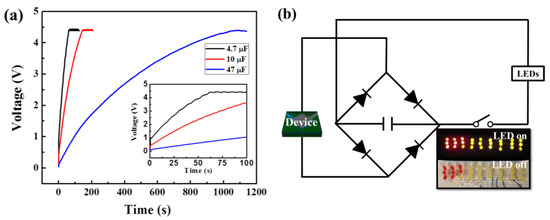 (a) Voltage-time charging curve of storage capacitors with different capacitances (4.7 µF, 10 µF, and 47 µF) under application of an external force with 30 Hz frequency. The inset shows an enlarged plot of voltage-time charging curves; (b) Electric charging circuit for the storage capacitor, and a picture of an LED assembly that glows by drawing power from the storage capacitor after energy harvesting is done.