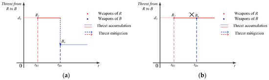 Throughout history, two or more countries are often in hostilities, such as the United States and the Soviet Union during the Cold War, India and Pakistan, and so on. Therefore, WSOS development planning transforms from a capacity to a military demand, as seen as an arms race. The R&D of national military weapons occurs in a situation requiring rapidity of development. Each country will set the other country or countries as the “reference” or “opponent” and change their own R&D strategies following the change of the R&D strategies of the opponent. Herein, we considered the dynamic competition between two parties, denoted as the attacker (R) and the defender (B). Generally speaking, R is a military power with advanced military technology and in a leading position in the military. R will independently develop a set of new weapons early on to attack B to gain an advantage at time tR1. The weapons developed by R are targets that B must counter. If all information about R is obtained by the intelligence department of B completely and opportunely at time tR1, then the initial damage (d1) caused by R, typically measured in casualties and economic damages [15], to B is known. As shown in Figure 1a, to defend the homeland from being attacked by R, B must develop new weapons (Bn) as CMs to mitigate the damage. However, as shown in Figure 1b, if B cannot intercept information about R’s new weapon or B’s CMs fail, the threat will remain.