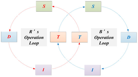 Modern warfare theory, which is also called Observe Orient Decide Act (OODA) theory [20], argues that a combat operation is a cyclic process. First is target discovery (TS), then information is delivered to the node D (SD). Next, node D analyzes the battlefield situation and charges node I (DI) to attack node T (IT). The close loop (TSDIT) is called the operation loop [21]. During the operation, both parties build their own operation loops, and treat all the opponent’s nodes as targets, as shown in Figure 3. Although only four classes of meta-functional nodes exist in one operation loop, each type of node can contain more than one weapon. Different weapons cooperate with others through loops. The number and technical performance of loops directly impact the combat effectiveness. The greater the number of loops, the stronger the threat capability. The fewer the nodes and edges in a loop, the better the threat effect.