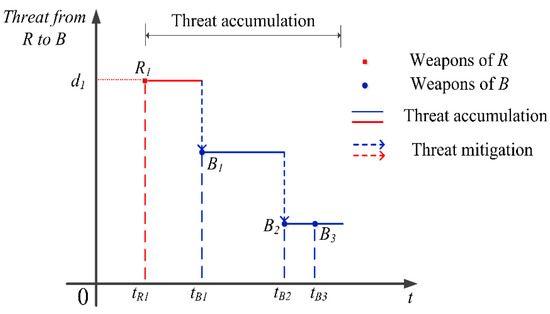 The goal of the development of new weapons is to reduce the threat from the opponent. The threat that changes over time is determined by the performance of one’s own weapons. For example, Figure 4 shows the dynamic change in the threat from R during the development process of B. The horizontal axis represents time and the vertical axis represents the threat. The red squares represent the deployment of R’s weapons and the blue dots represent the deployment of B’s weapons. The threat from R increases after R’s new weapon R1 is deployed. Then, the threat accumulates for a period of time. Once B has developed new weapons against R, R’s threat level decreases. Then, R develops new weapons to increase the threat again. That is to say, the threat changes with the deployment of new weapons, and accumulates over time. B selects B1, B2, and B3 from the optional weapons collection. B1 and B2 form operation loops that cover R with other weapons, and the threat from R decreases. Although B develops B3, it cannot form an operation loop that covers R. Therefore, the threat from R remains unchanged.