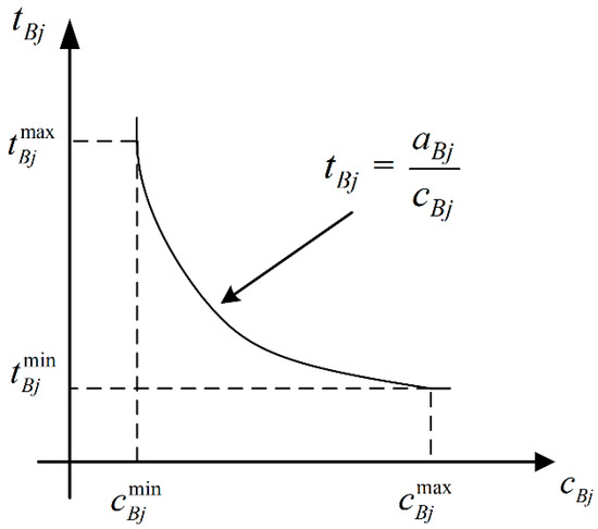 In reality, a negative correlation exists between the R&D time and investment. To ensure the smooth development of weapons, the investment of each weapon cannot be lower than a certain threshold cmin, otherwise it will not be successfully developed. The lowest investment amount corresponds to the longest development time tmax. As the investment gradually increases, the development time correspondingly gradually shortens. However, as the marginal effect of investment decreases, the development time declining rate slows. In addition, due to technical restrictions, the development time cannot continually decrease. No matter the amount of the investment, the development time will not be less than the shortest time tmin. The corresponding investment is now cmax. Therefore, for the relationship between time and investment, the inverse scaling function model was designed as shown in Figure 5. Herein, aBj generally represents the technical difficulty in the development process.