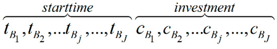 In Golany’s model [15], tBj was used to determine the development time of each weapon. tBj was determined by the level of intensity, which is a discrete variable; therefore, tBj was also a discrete variable. As opposed to Golany’s model, tBj = aBj/cBj is used to describe the development time, determined by the allocated investment, which is quite realistic in defense contracting. The continuous variable cBj implies continuity of tBj, resulting in a wider range of possible solutions. Hence, the problem faced by B is to decide which weapon to develop, when to start development, and what proportion of the available resources to allocate to each weapon based on the current weapons. The objective is to minimize the cumulative damage over the time horizon, subject to budgetary constraints.