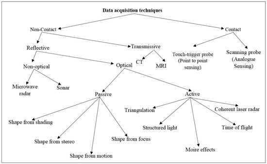 The different techniques for data acquisition can be classified into contact and non-contact methods as shown in Figure 1. The main purpose of the 3D data acquisition is to collect and record object information pertaining to shape and dimensions either using touch probes (contact) or optical systems (non-contact). In the contact method, a probe makes contact with the object’s surface, while in the non-contact approach, there is no physical contact with the object’s surface. Non-contact methods are based on different techniques including photogrammetry [2], triangulation and time of flight [3], as well as utilize various light sources such as laser and white light [4].