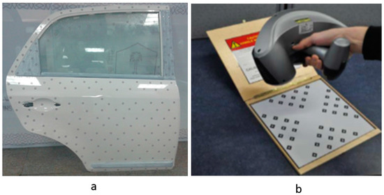 (a) Car door with positioning targets; (b) Calibration of the scanner.