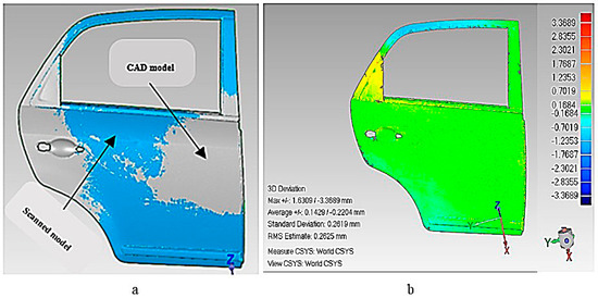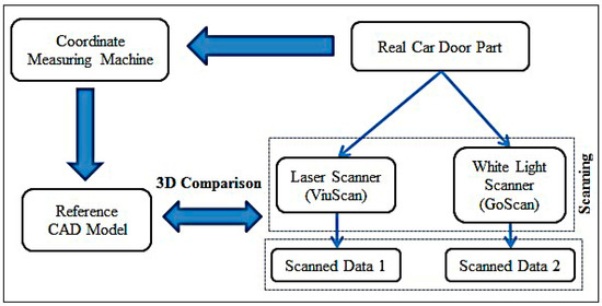 The procedure to compute the accuracy that can be achieved with each scanner can be realized in Figure 5. Initially, a CAD model was obtained using the CMM for the real car door part. This CAD model was referred as “reference CAD model”. Subsequently, the scanned models acquired through laser scanner, as well as the white light scanner, were evaluated with reference CAD model using 3D comparison in Geomagics (Geomagics 2014, 3D systems, Rock Hill, SC, USA).