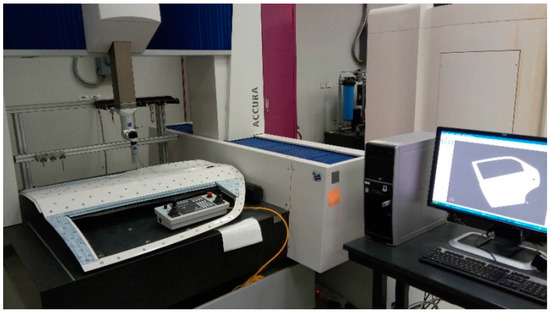 A medium-size bridge-type CMM (Accura, Zeiss, Oberkochen, Germany) with an accuracy of (1.6 + L/333) μm, which complied with DIN EN ISO 10360-2:2001, was employed in this investigation as shown in Figure 6. A continuous passive scanning touch probe system was utilized to collect the data points on the car door. Since the accuracy of point coordinates is dependent upon scanning parameters therefore, it was very important to select the appropriate scanning parameters. The scanning parameters adopted to obtain the data points for reference CAD model were: scanning speed—5 mm/s, distance between lines—0.3 mm, distance between points—0.0025 mm, and distribution of points—uniform.