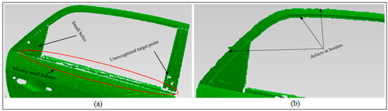 Defects in the data points of the white light scanner—(a) missing data; (b) edge defects.