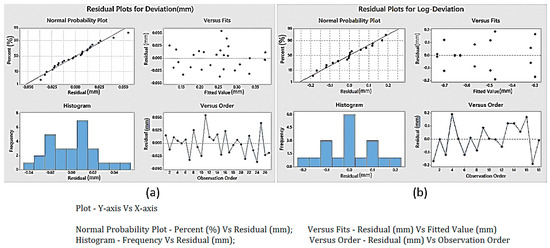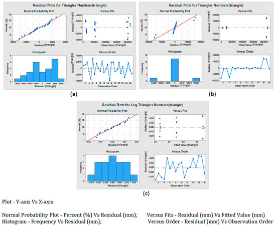 To confirm the normality of the data sets, a normality test of data points for each response was carried out. Subsequently, to analyze the results, ANOVA and main effect plots were studied. The normality assumption for accuracy shown in Figure 11 depicts that the data points were normal and could successfully be used for ANOVA. Similarly, normality tests for the other response (scanning time) of the two scanners confirmed their normality for consecutive analyses as shown in Figure 12. Normality test for the number of triangles in laser scan was valid as shown in Figure 13a, whereas the normality test for the number of triangles in white light scan was not valid as shown in Figure 13b. Therefore, the Log data transformation was conducted and the normality assumption was tested again as shown in Figure 13c. It is clear that the normality assumption was valid (refer Figure 13c).