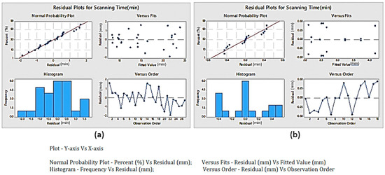 The measurement units for residuals are same as that of the response. For example, the measurement unit for the residual of scanning time is in minutes. An ANOVA test with 95% confidence was performed to determine the significance of the parameters, as well as the interaction between them.