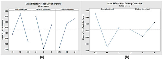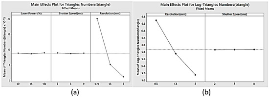 The main effects plot shown in Figure 14a clearly shows that in case of the laser scanner, the highest accuracy was achieved with a laser power of 100%, shutter time of 6 ms, and a resolution of 0.75 mm. In case of the white light scanner (Figure 14b), the highest accuracy can be achieved with a shutter time of 4 ms and a resolution of 1.5 mm. As shown in Figure 15a, the lowest scanning time was obtained with a laser power of 100%, shutter time of 6 ms, and a resolution of 3 mm in case of the laser scanner. In the case of the white light scanner, the lowest scanning time was achieved at a shutter time of 8 ms and a resolution of 1.5 mm (Figure 15b). The lowest number of triangles was obtained at a resolution of 3 mm in the case of both the laser and white light scanners as shown in Figure 16a,b.