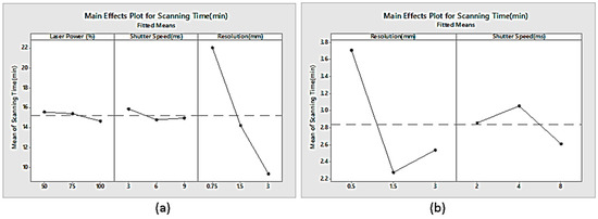 Main effect plots for scanning time: (a) laser scanner; (b) white light scanner.