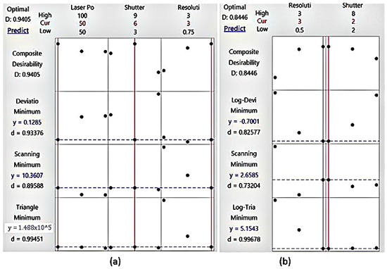 The optimization plots obtained using response optimizer (courtesy: Minitab) for the two scanners are shown in Figure 17a. The desirability value for each case should either be one or close to one in order to validate this analysis. Since, the composite desirability (0.9405) is close to 1, it indicates that the objective of highest accuracy in the minimum scanning time with the smallest number of triangles can be accomplished with a laser power of 50%, shutter time of 6 ms, and resolution of 3 mm Similarly, the composite desirability for the white light scanner is close to 1 (0.8446). Hence, a shutter time of 8 ms and resolution of 1.5 mm can be used to achieve highest accuracy in the minimum scanning time with the smallest number of triangles as shown in Figure 17b.