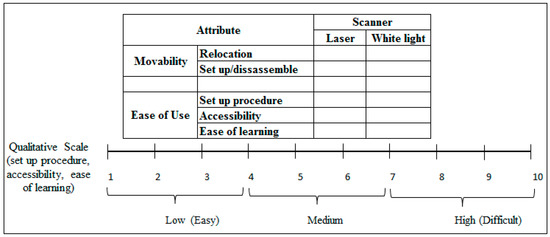 As part of this study, a user-based study was carried out and administered to the users of the scanners. It included several questions regarding the set-up procedure, ease of use, and accessibility. The users were asked to rate the set-up procedure, ease of use, and accessibility. The users were requested to rate the scanners on the scale of 1 to 10, with 1 pointing at low value, while 10 represented higher value as shown in Figure 18. Notice that the students and researchers who had undergone at least eight hours of training on the scanners or had used scanners in some of their projects were eligible for this study. A total of ten users, based on their experience, rated the different scanners. Once all the ratings were obtained, an average was computed to achieve the final ratings. Based on the study, the qualitative comparison of two scanners was obtained. It was found that the white light scanner was easy to move from one location to another as compared to the laser scanner. The reason can be attributed to its lower weight, as well as lower set up time (or dismantle time. Moreover, white light scanner was easy to use in contrast to the laser scanner. According to the majority of users, the white light scanner was easy to understand; it also had higher accessibility on the part.